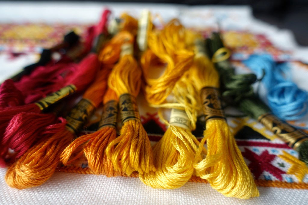 Previously, I had selected threads that match the colors of the original. But the variety of colours and the vividness of the design is captivating and I dreamed up the idea of embroidering it using shades of the sun when it is just rising. Sunrise is the beginning of something new. When I wake early and feel around me the peacefulness of an early morning, when the world has not yet fully left behind its dreams, I have the feeling that this day, EVERYTHING is possible.